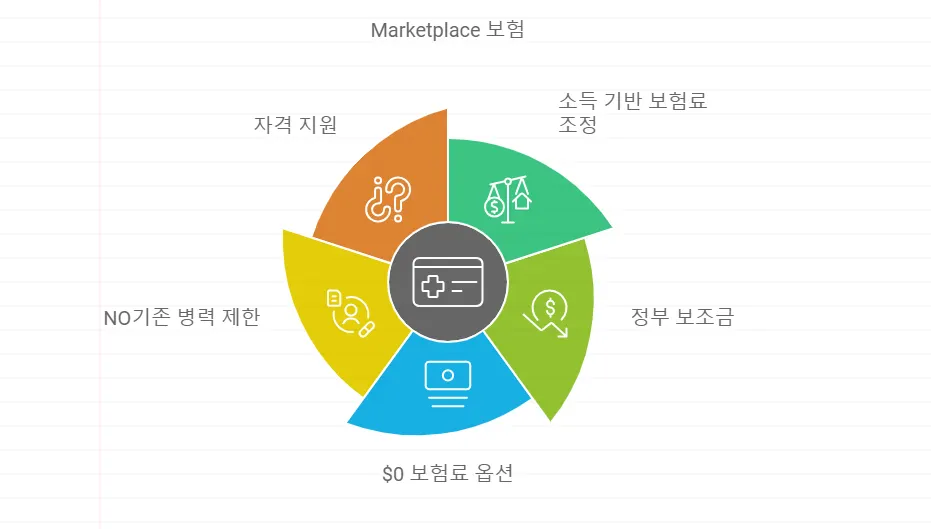 Marketplace(건강보험 거래소) 보험의 주요 장점은 소득에 따라 보험료가 조정된다는 것입니다. 소득이 낮은 경우 정부 보조금을 통해 보험료를 절감할 수 있으며, 일부는 $0 보험료로도 가입할 수 있습니다. 이는 보험 혜택을 많이 받을 수 있는 좋은 기회가 됩니다.