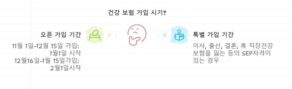 다만, 특별 가입 조건(SEP: Special Enrollment Period) 에 해당하는 경우에는 오픈 가입 기간이 아니어도 가입이 가능합니다. SEP는 이사, 출산, 결혼, 실직 등 특별한 상황에 해당할 때 주어집니다.