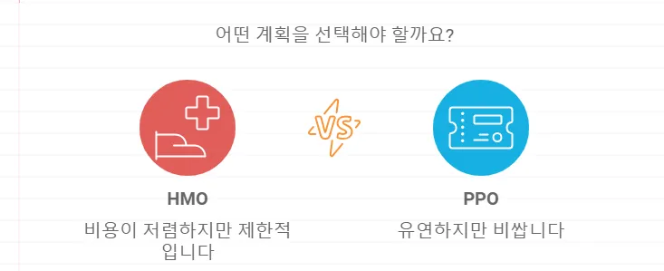 HMO (Health Maintenance Organization): 네트워크 내의 병원과 의사만 이용 가능하며, 주치의(Primary Care Physician)를 통해 진료를 받아야 합니다. 비용이 저렴하지만 네트워크 외 진료 시 보험 혜택이 없습니다.